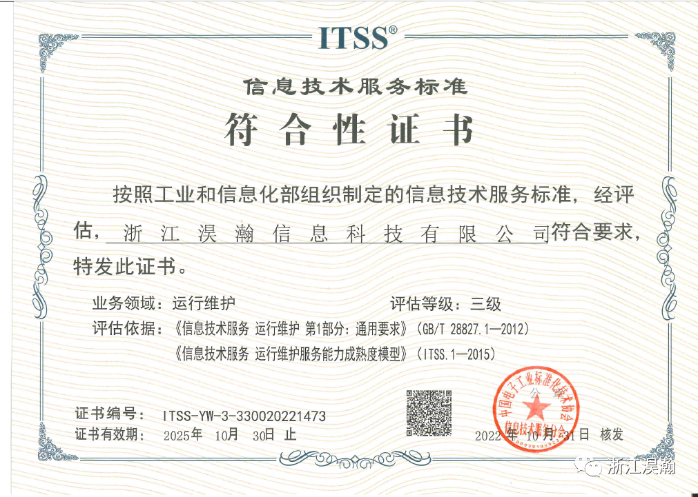 浙江淏瀚榮獲“ITSS信息技術服務标準三級證書(shū)”