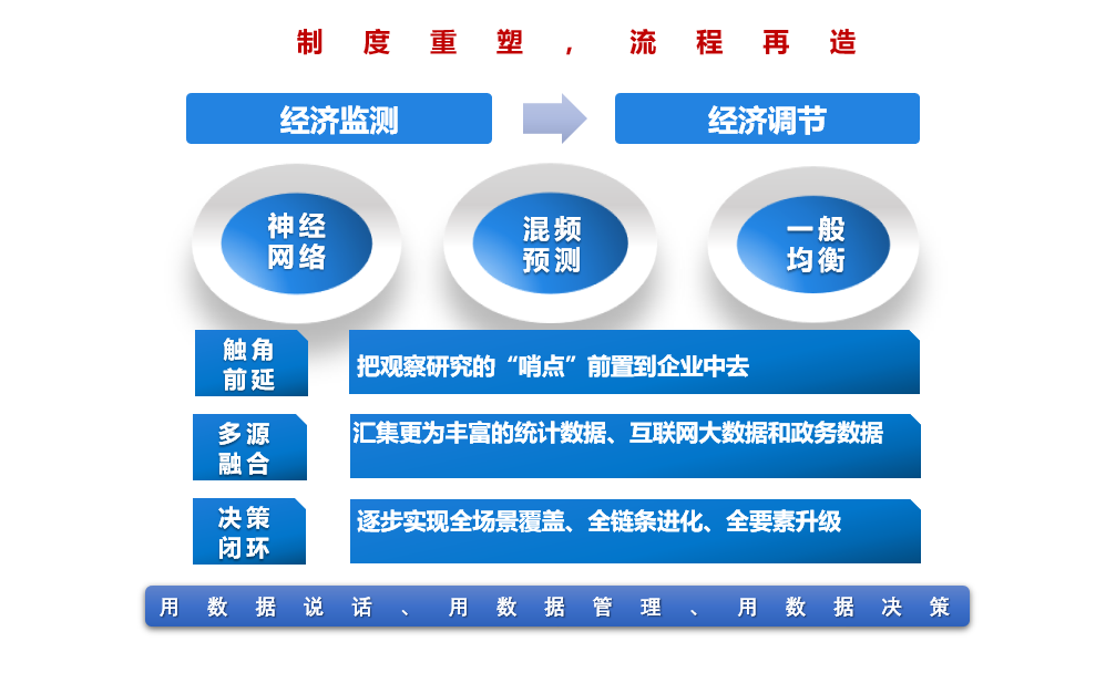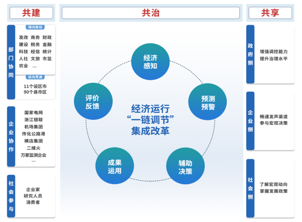 按照數字化改革的要求,以“智能化”為升級方向,突出流程再造和制度重塑;從經濟感知(zhī)切入,分(fēn)階段建設“經濟感知(zhī)—預測預警—輔助決策—成果運用—評價反饋”5大(dà)場景,通過拓展數據基座、創新數據産品、強化部門協同、提供優質服務等重點舉措,加快形成定量閉環的治理體(tǐ)系,以經濟運行“一(yī)鍊調節”集成改革推動跨部門業務協同、數據共享,構建政府、企業、行業的大(dà)協同機制,形成共建共享共治的新能力,支撐實現“整體(tǐ)智治”。