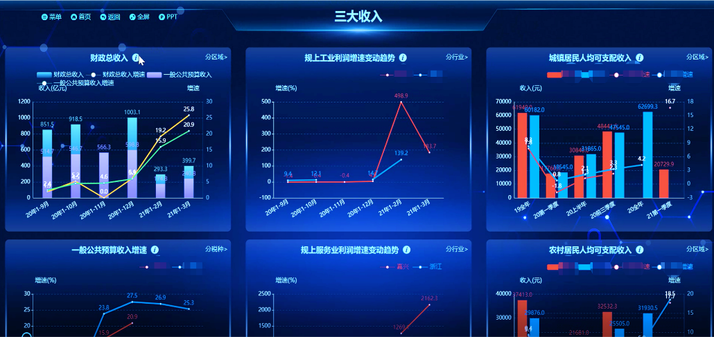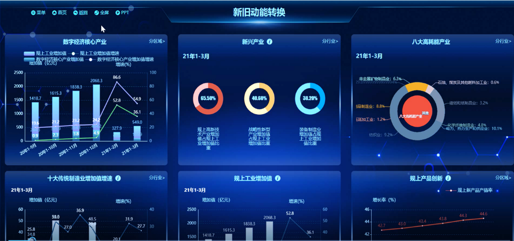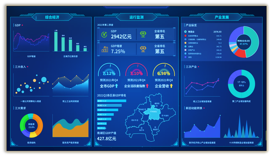 基于融合後的政府數據和高頻(pín)的社會數據,通過經濟理論和大(dà)數據、機器學習、數據可視化等相結合的數字化手段,涵蓋經濟動力指數、産業運行指數、區域運行指數,以及先行指标的多種預測模型等經濟分(fēn)析領域的多個典型大(dà)數據應用場景;