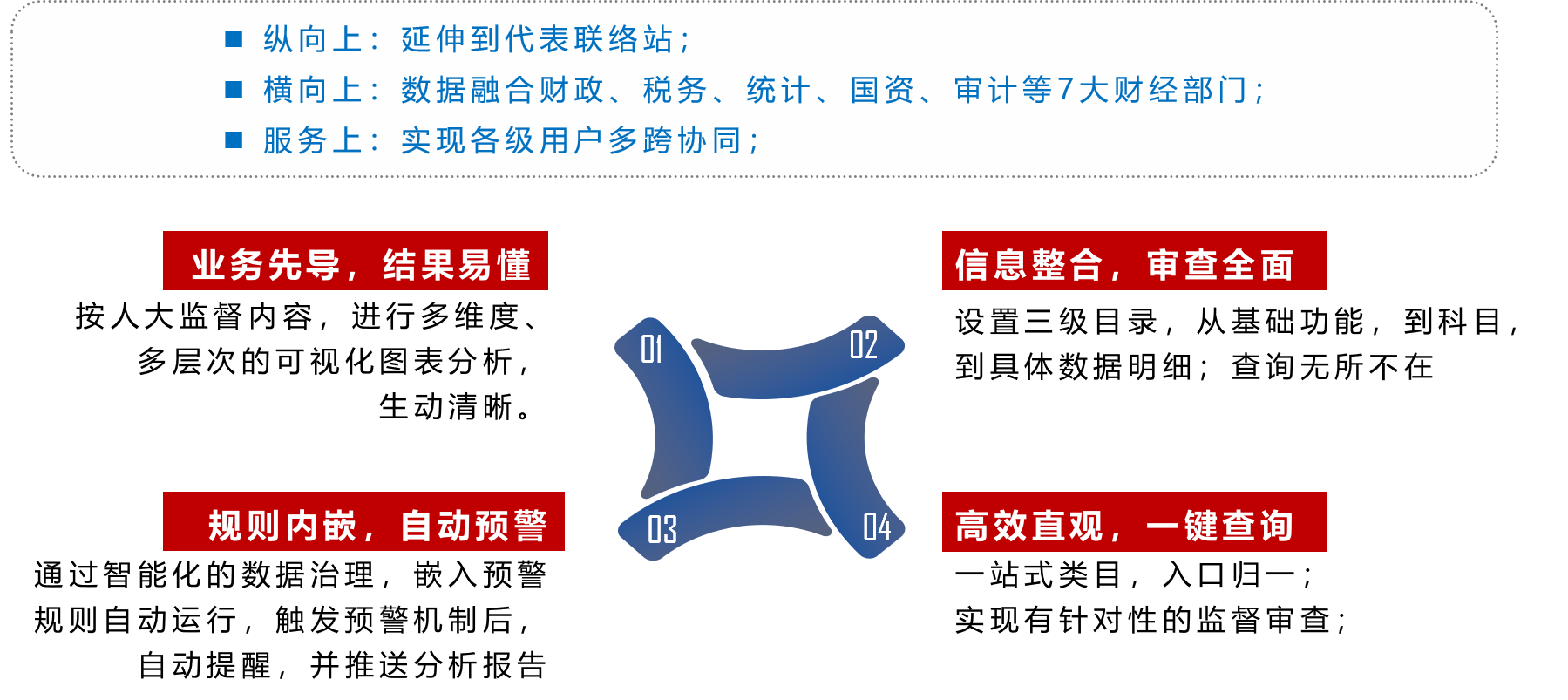 利用現代網絡信息技術,對接财政、發改、審計等各部門數據;通過數據采集信息化,實現對政府全口徑預算決算審查,國有資(zī)産(政府債務)、政府投資(zī)項目(民生(shēng)實事項目)等有效監督。加強對預算編制、執行、調整及決算全過程監督,實現報表查詢、數據分(fēn)析、智能預警、動态監控等功能。